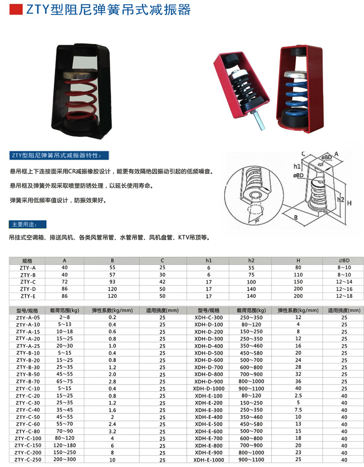 吊式弹簧减震器采用冲压成型加工,配合合成橡胶零组件组合,外观为静电涂装处理,并经盐雾试验严格品管;结构美观,上下端均增加CR材质橡胶件,进一步隔绝振动及噪音。为吊挂式空调设备、风机及大小管路等各种吊式设备所采用。上海松夏减震器有限公司生产的ZTY型吊式弹簧减振器在市场上均有广大和良好的应用。经过厂家多年的研发和改良,减震效果基本可达95%—100%。